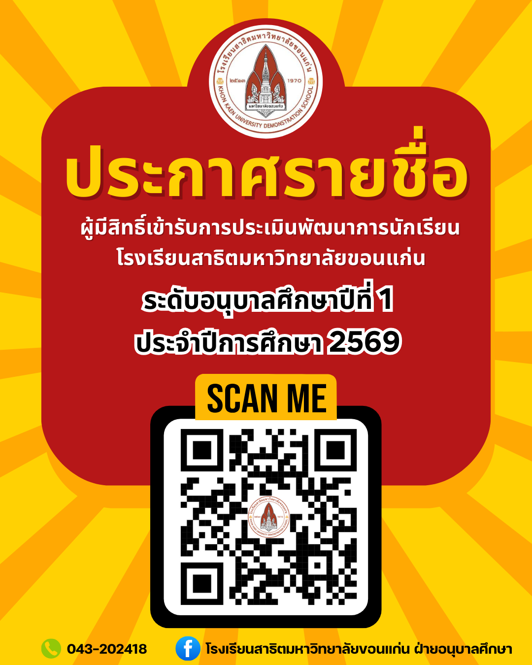 ประกาศรายชื่อผู้มีสิทธิ์เข้ารับการประเมินพัฒนาการนักเรียนโรงเรียนสาธิตมหาวิทยาลัยขอนแก่น ระดับอนุบาลศึกษาปีที่ 1 ประจำปีการศึกษา 2569
